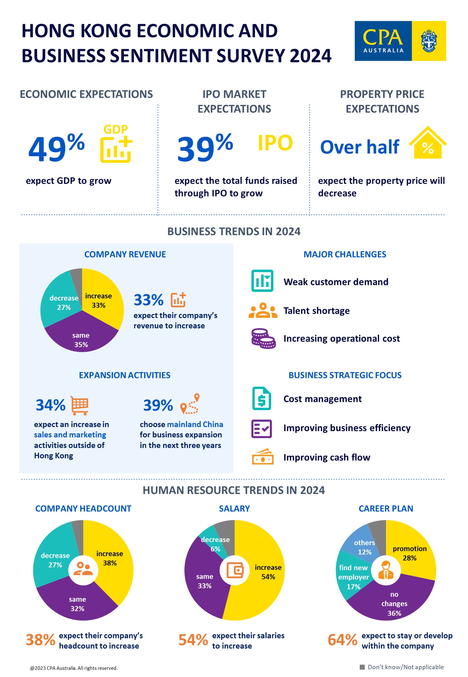 Nearly two-fifths (39 per cent) of respondents expect the total funds raised through Hong Kong initial public offerings (IPOs) in 2024 to increase. High interest rates and weaker outlook is also impacting real estate dynamics, with over half of the respondents forecasting falling property prices next year.