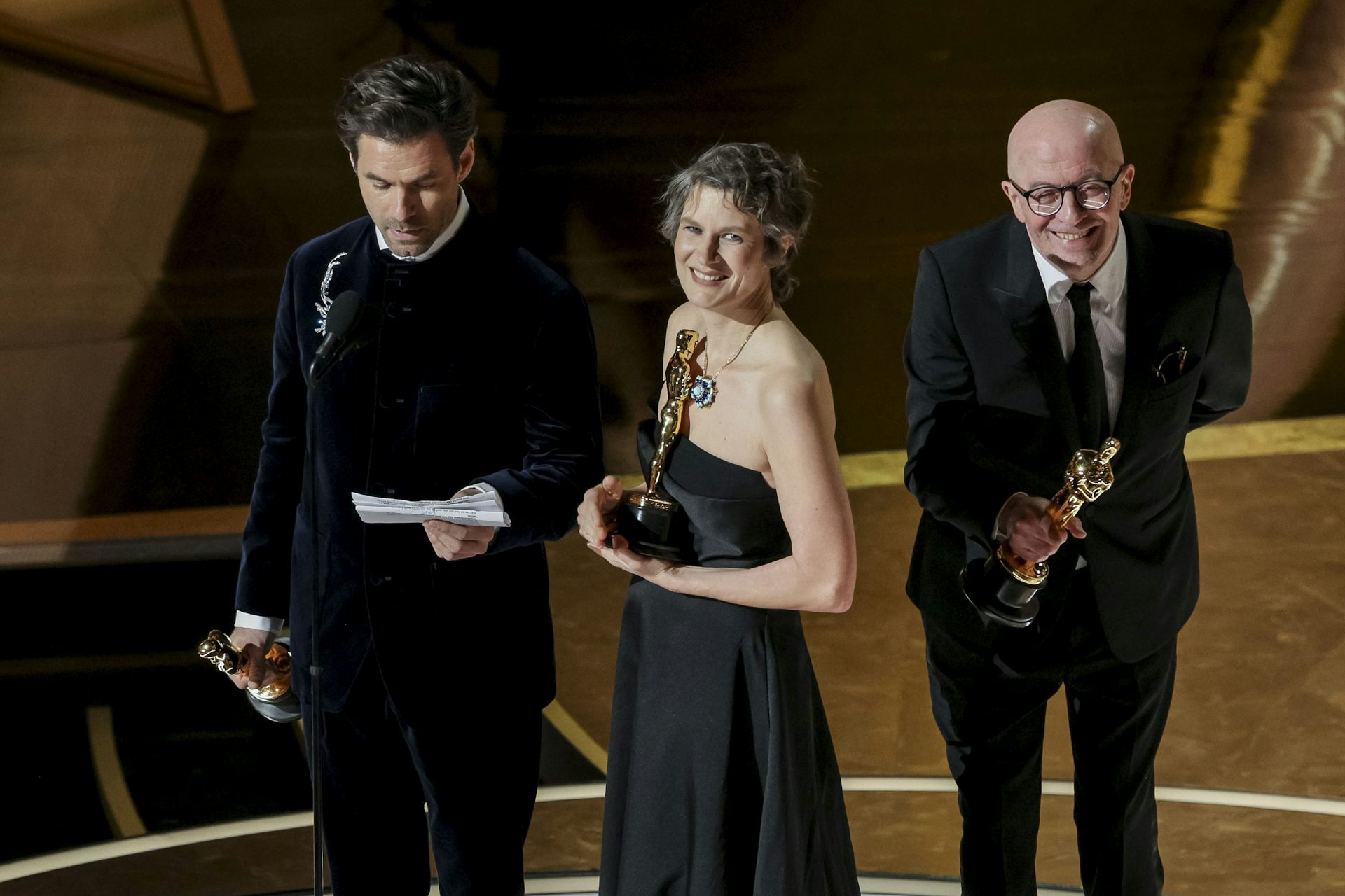 The directors of No Other Land, receiving their Oscar for best documentary, shared the one clear critical voice. Palestinian Basel Adra wished his newborn daughter a life without the fear that governs daily life in his homeland. Israeli co-director Yuval Abraham agreed: “There is another way. It’s not too late for life and for the living. There is no other way.”