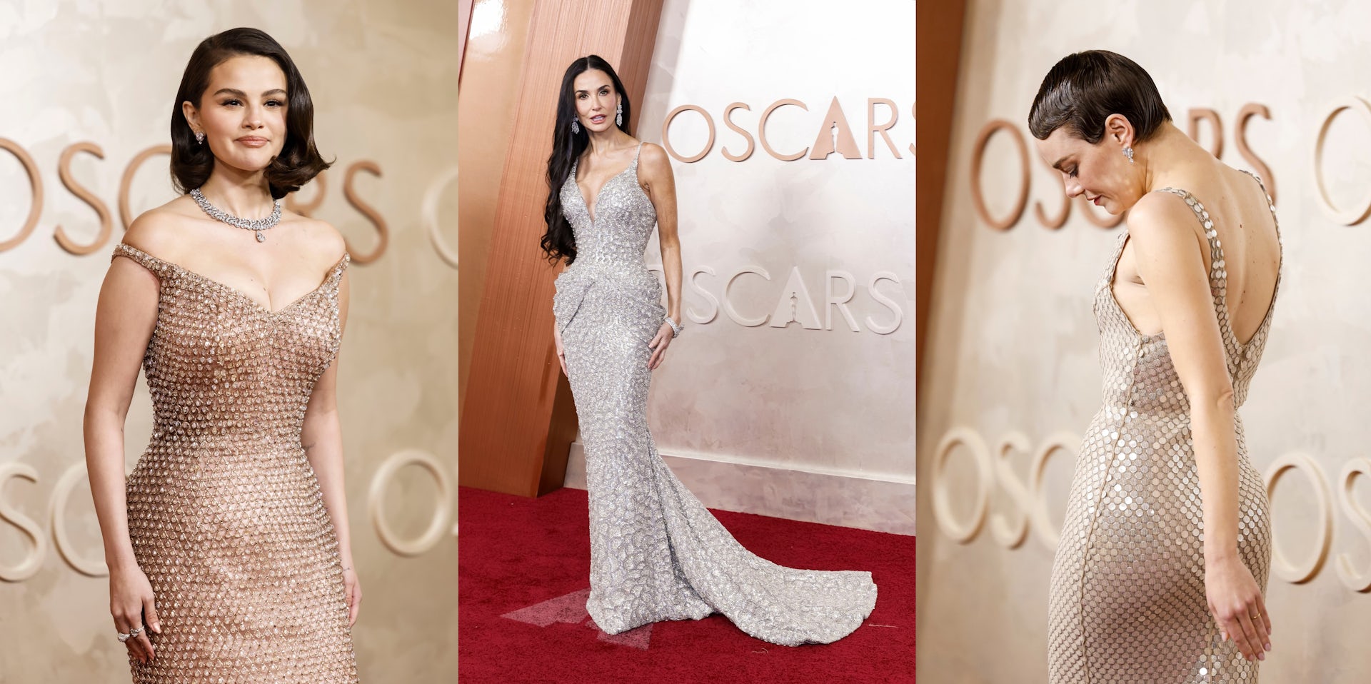 Metallic gowns that resemble the Oscar statue are a familiar sight at the Academy Awards and this year was no different. Some of the standouts included best actress nominee Demi Moore in a magnificently glittering silver Armani Privé gown, Selena Gomez in custom Ralph Lauren encrusted with 16,000 individual blush-toned jewel teardrops, and Emma Stone in a minimalist Louis Vuitton sheath covered in iridescent fish scales.