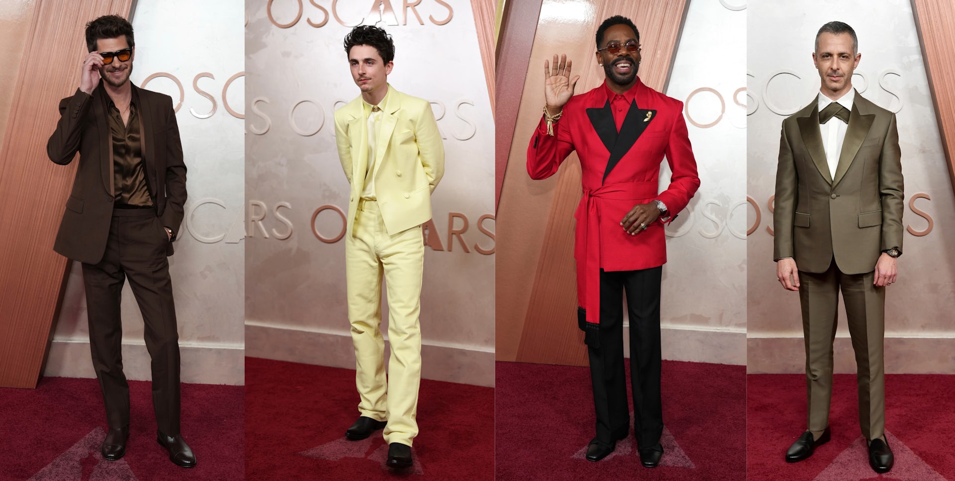 Best actor nominee Timothée Chalamet lived up to his reputation for monochrome, richly hued ensembles in a custom butter yellow leather suit by Givenchy, paired with a matching silk shirt and delicate neck brooch in place of a tie. His best actor nominated compatriot, Colman Domingo (one of the best dressed men in Hollywood) was pristine in a double-breasted red silk jacket with black lapels, black trousers and matching red shirt by Valentino, similarly eschewing a tie in favour of a fine gold brooch. Andrew Garfield wore louche chocolate brown Gucci and Jeremy Strong wore a suit by Loro Piana in an unusual tone of olive green.