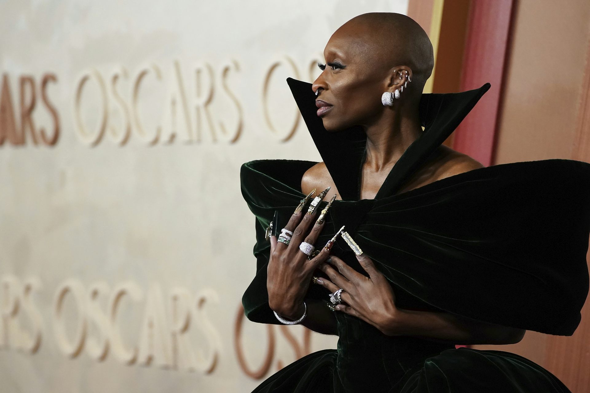 The most remarkable bow of the night though was best actress nominee Cynthia Erivo in a structured deep emerald-green velvet Louis Vuitton gown, the broad, wing-like sleeves of which were crafted as a bow.