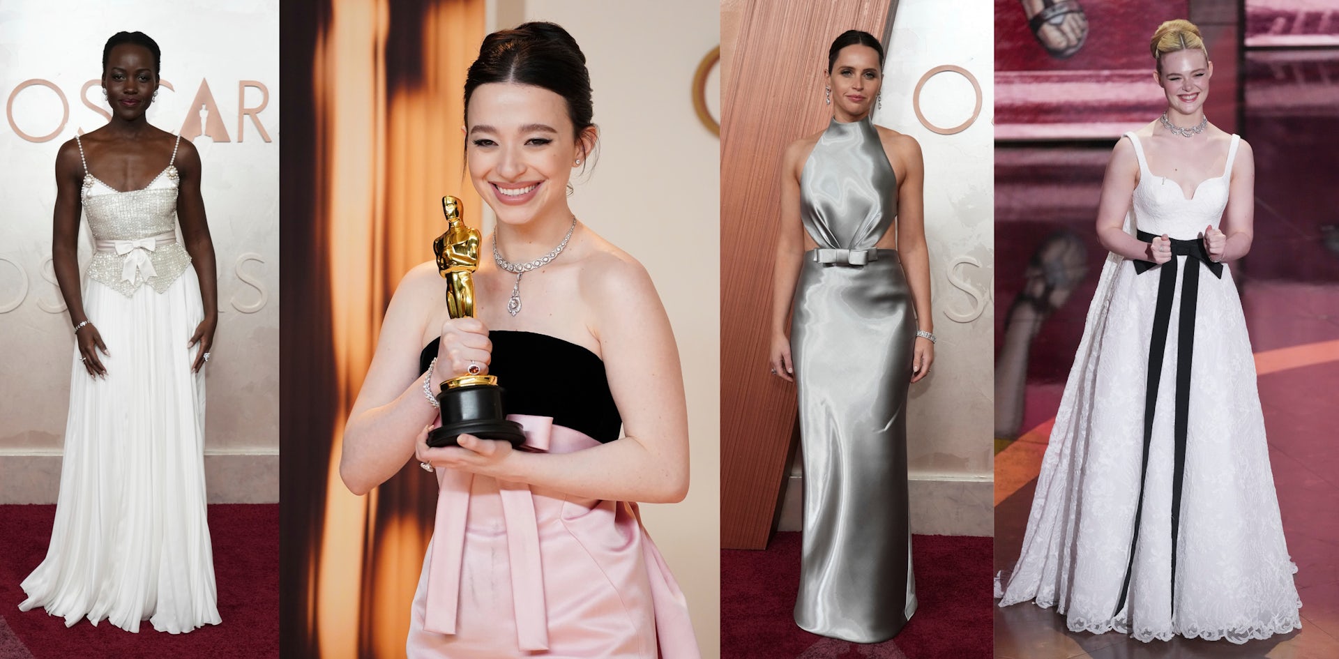 Best actress winner Mikey Madison in black and pink Dior, best supporting actress nominee Felicity Jones in shimmering liquid silver Armani, Elle Fanning in white and black Givenchy and Lupita Nyong’o in white Chanel were all adorned with bows at their waists.