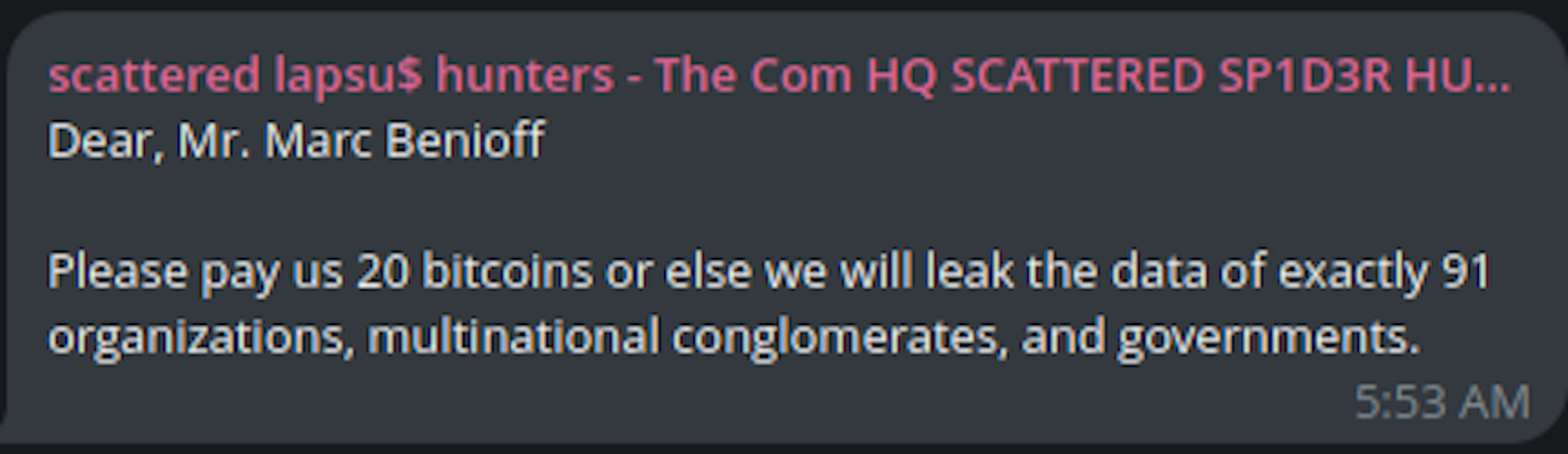 In mid-August, ShinyHunters posted on Telegram they have been working with known threat actors Scattered Spider and Lapsus$ to target companies such as Salesforce and Allianz Life. The channel was taken down by Telegram within days of being launched. The group publicly released Allianz Life’s Salesforce data, which included 2.8 million data records relating to individual customers and corporate partners.