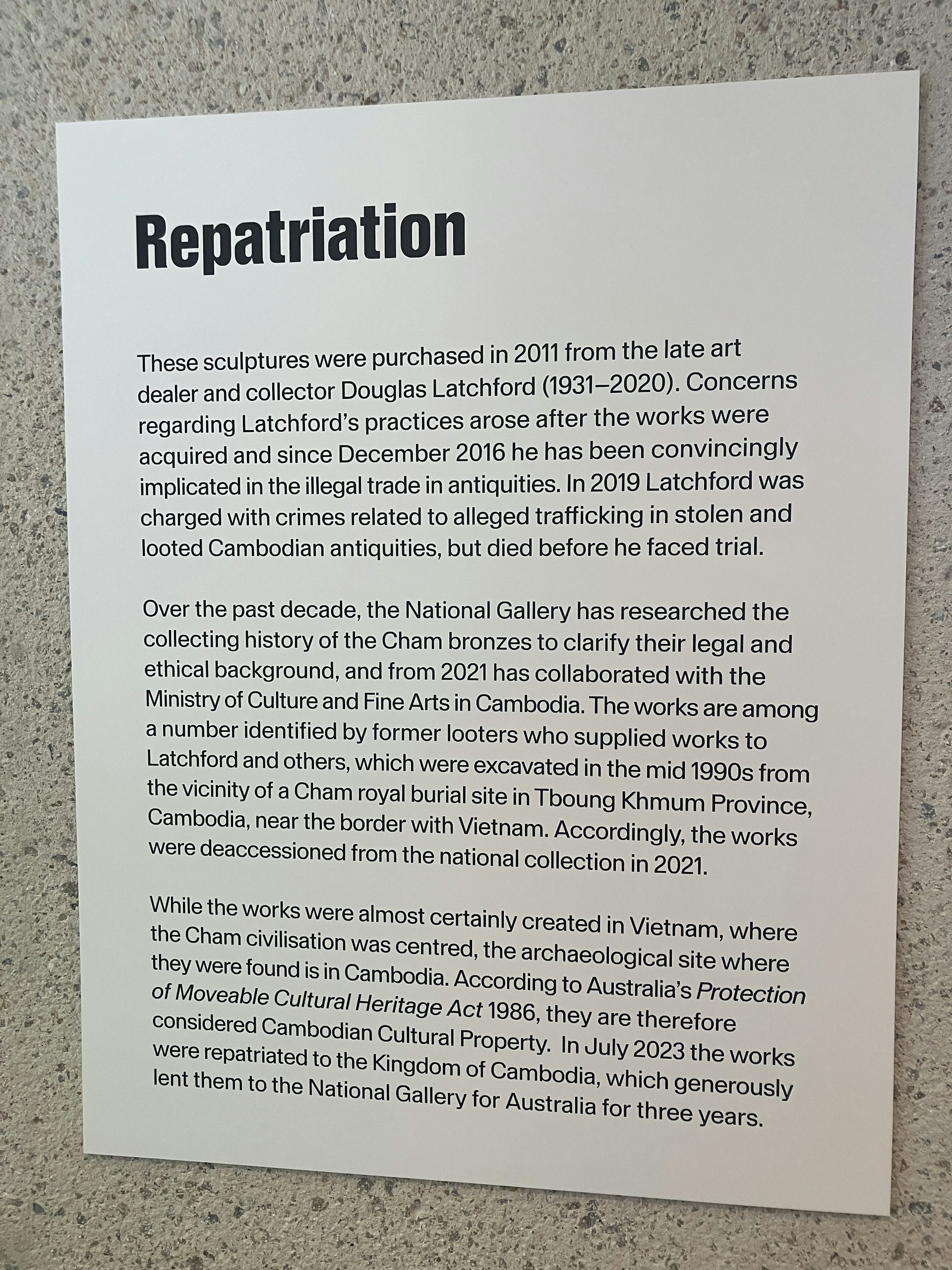 The NGA says it followed the Protection of Movable Cultural Heritage Act 1986 in returning the bodhisattvas to Cambodia. But the wall text for the statues acknowledges their complexity: