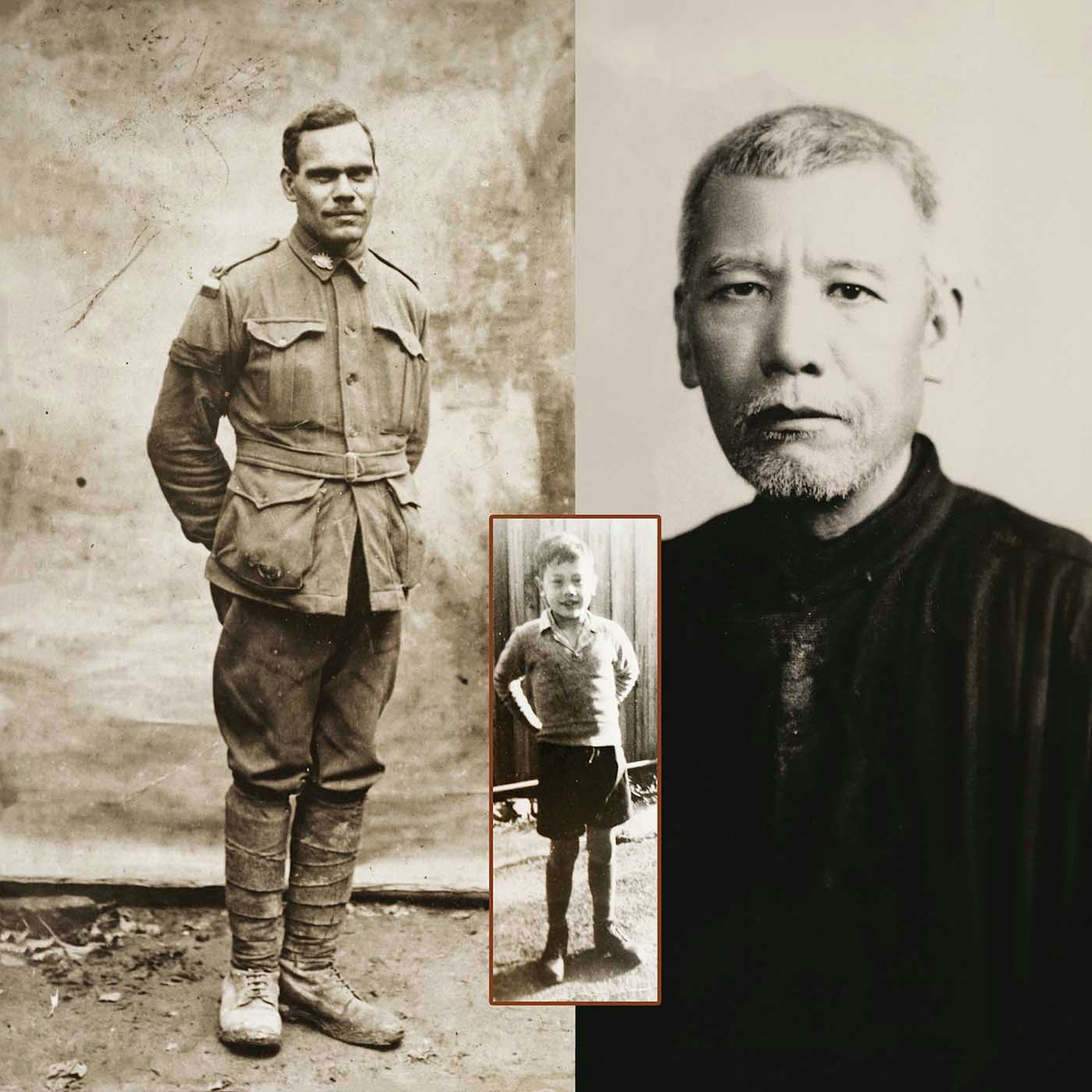 An 8-year-old Michael Laing stands between his Aboriginal grandfather Gordon Charles Naley and his Chinese grandfather Leung Kee.