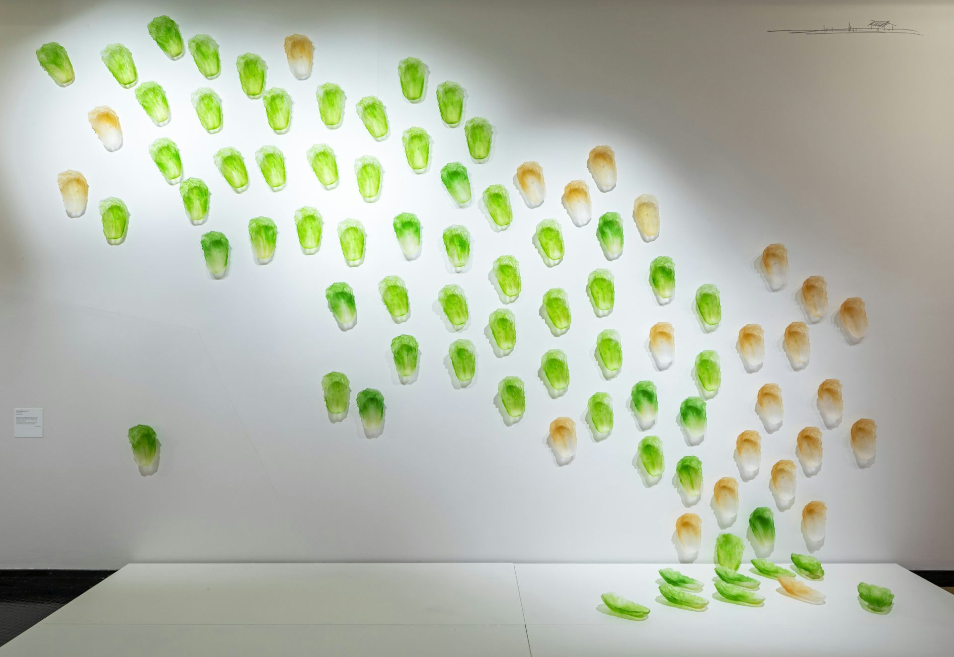 Zhou’s glass cabbage leaves, in shades of jade and ochre, call to mind a comparably sweeping installation of glass coolamons created at the Canberra Glassworks by Ngambri-Ngunnawal artist Paul Girrawah House and glass artist Tom Rowney. Both works cast a humble and familiar object in a spectacular form with an elegant grafting of cultural experiences.