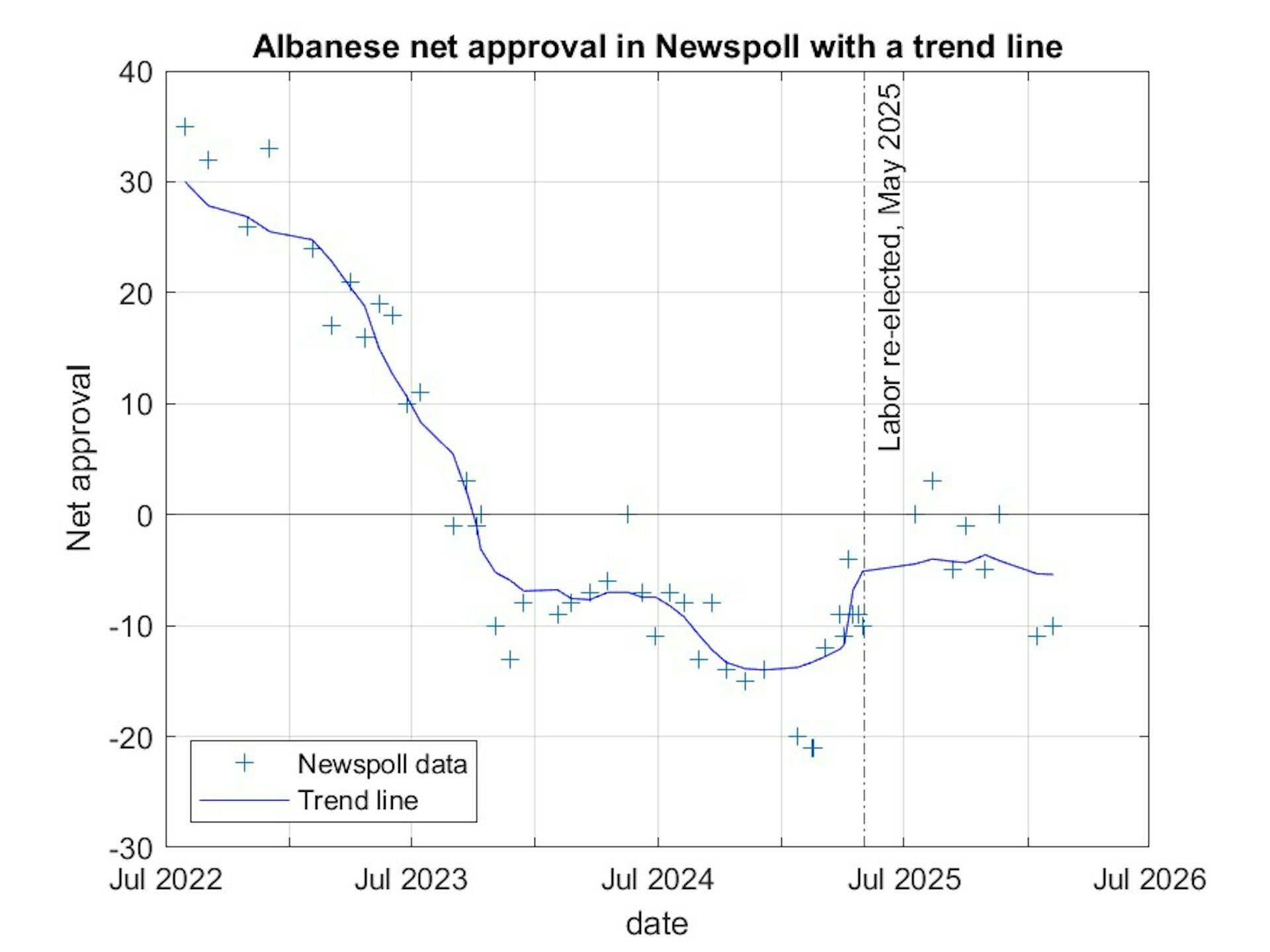 This graph shows Albanese’s net approval in Newspoll since he became PM in 2022, with a smoothed line fitted.