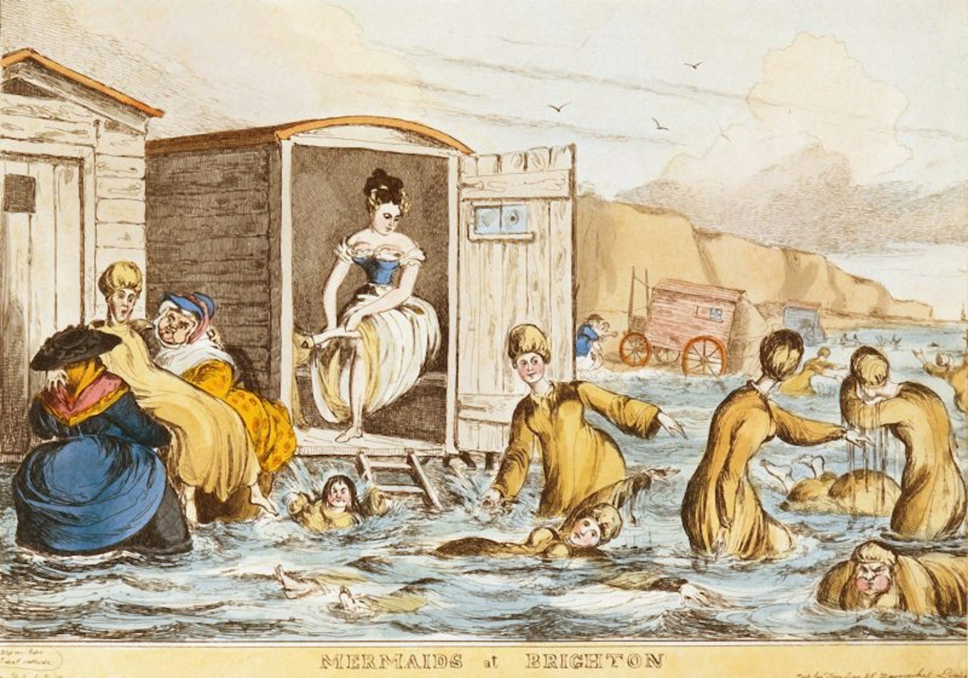A 19th century engraving by British artist William Heath, ‘Mermaids at Brighton’ shows women swimming in the ocean behind their bathing machines.