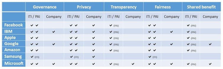 Initiatives big tech companies have signed up to in particular categories of data ethics.