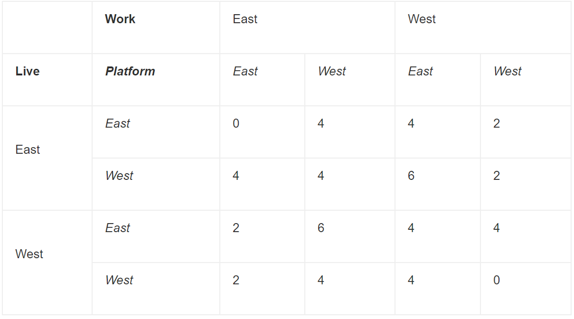 The table below shows the extra travel time in minutes depending on platform locations and access points for a traveller’s origin and destination. The average time for such a one-sided configuration of train stations is 3.25 minutes each way.