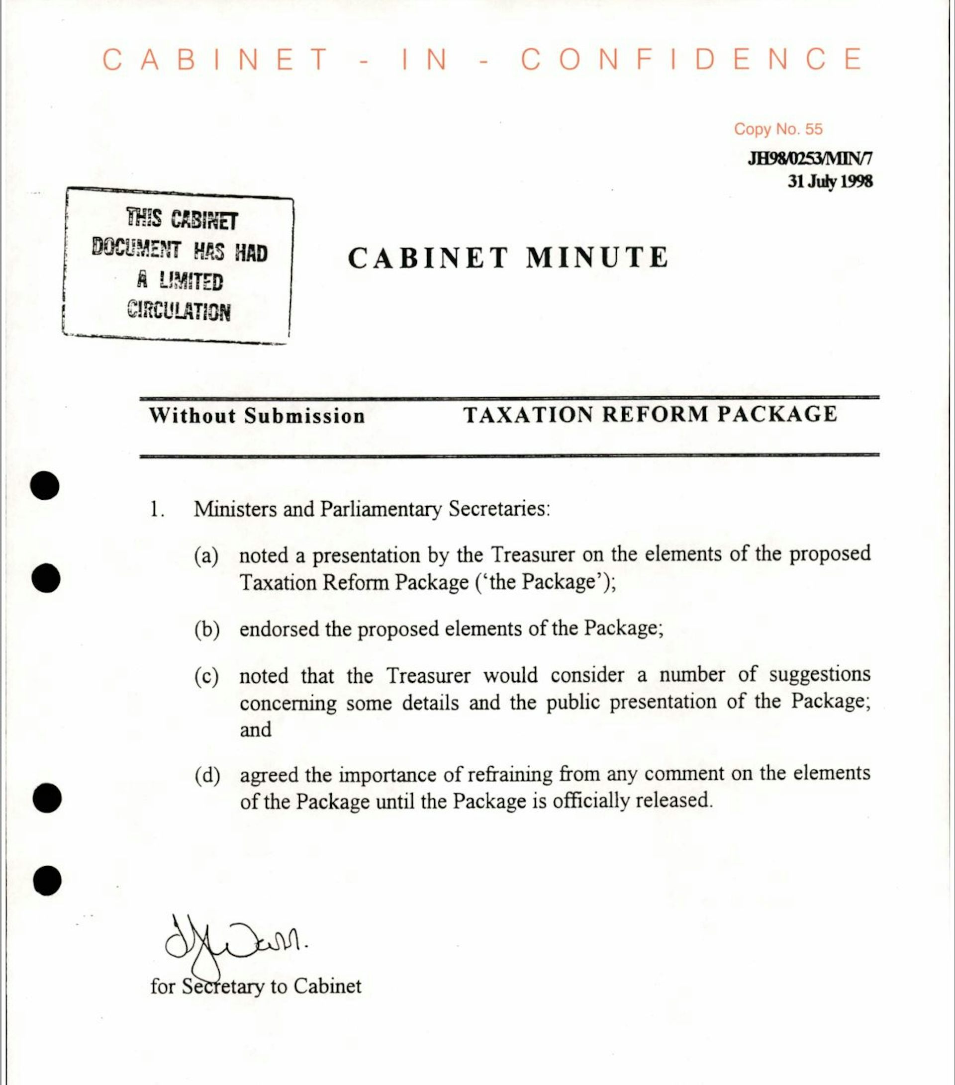 You’ll find one minute in there that says the treasurer presented a proposal for tax reform, which was adopted. That’s the minute of a meeting that went on for seven hours saying how every group would be in front or behind. I became the government’s PowerPoint guy.