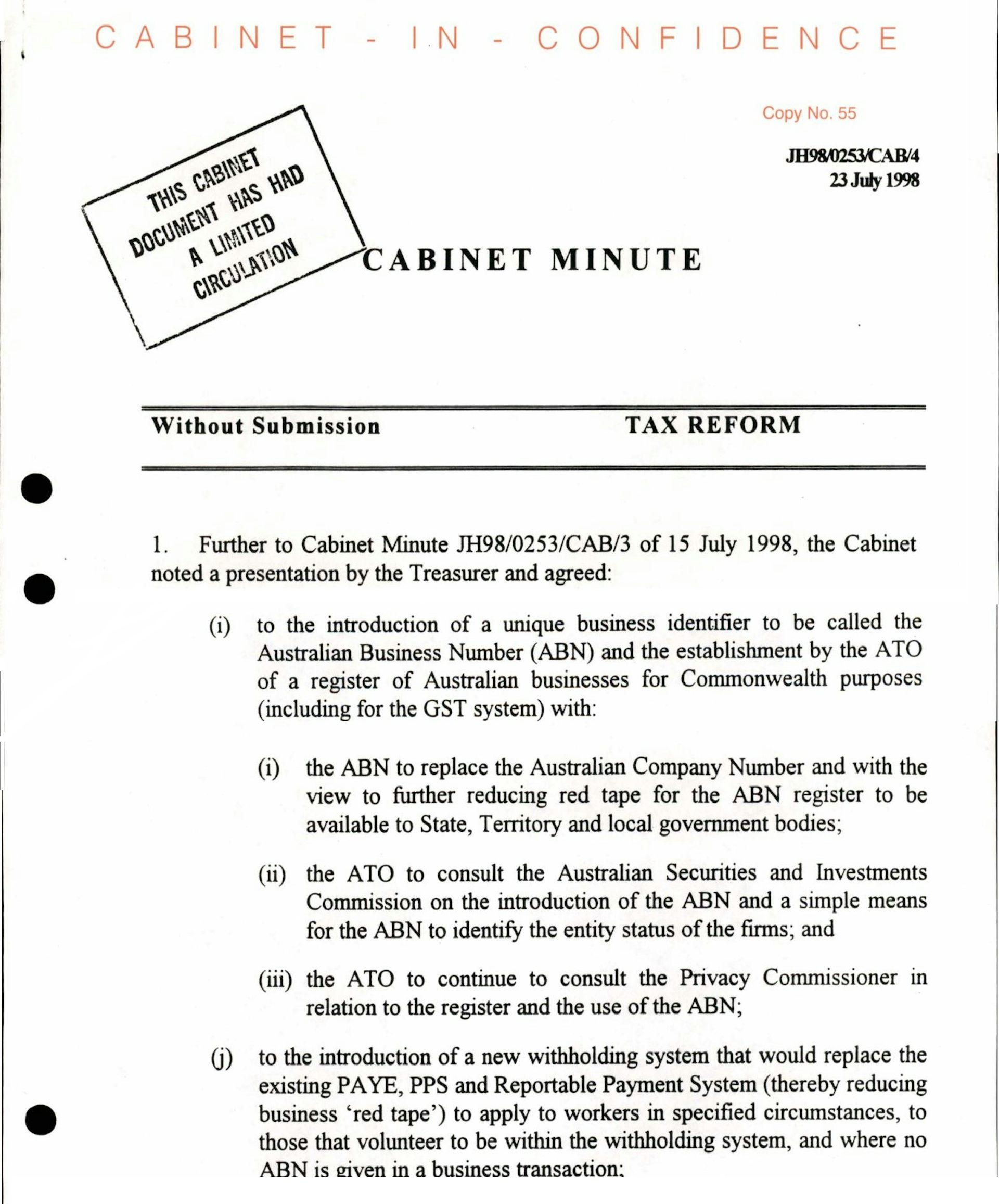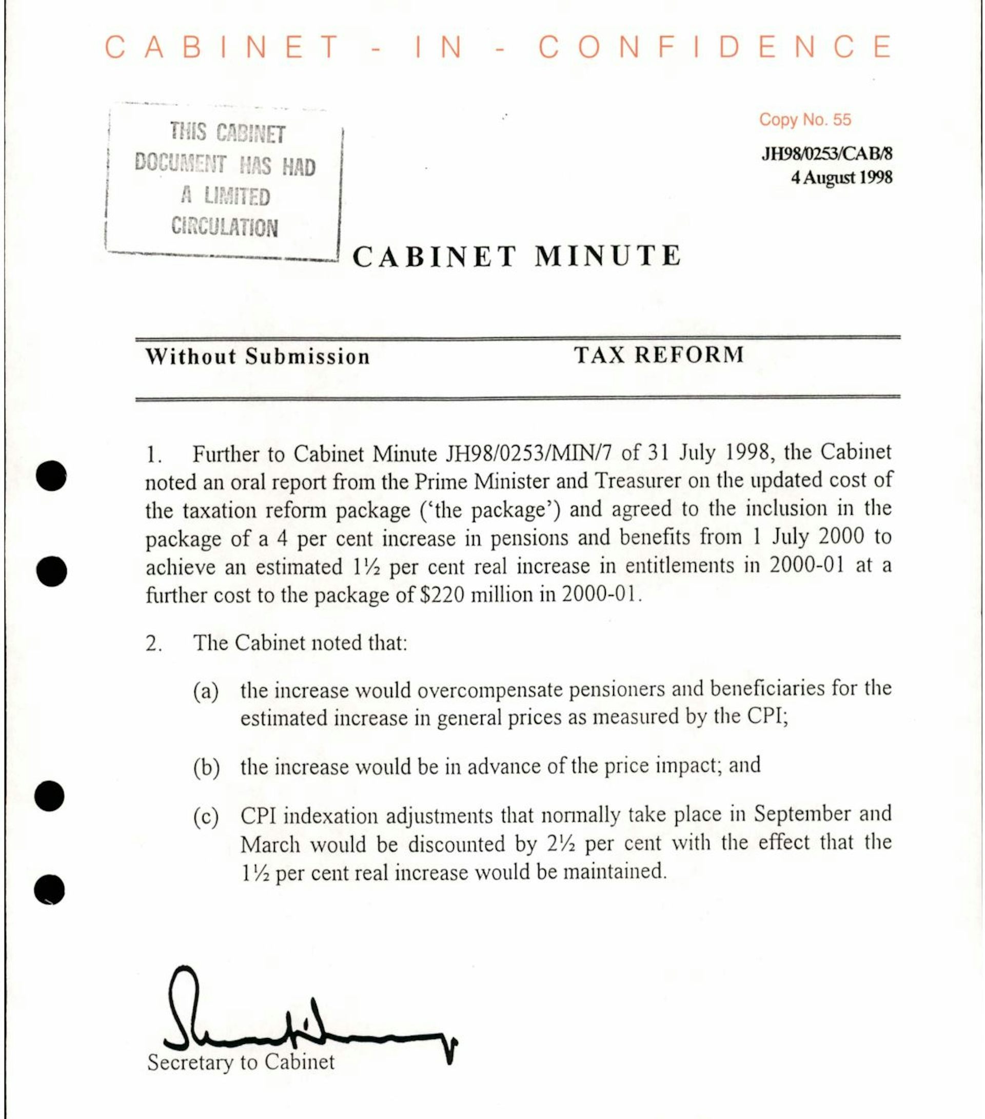 The cabinet records for 1998 and 1999 released this morning by the National Archives don’t give us much of an idea about what made Prime Minister John Howard try one more time, within a year or so of being elected on a promise that there is “no way a GST will ever be part of our policy”.