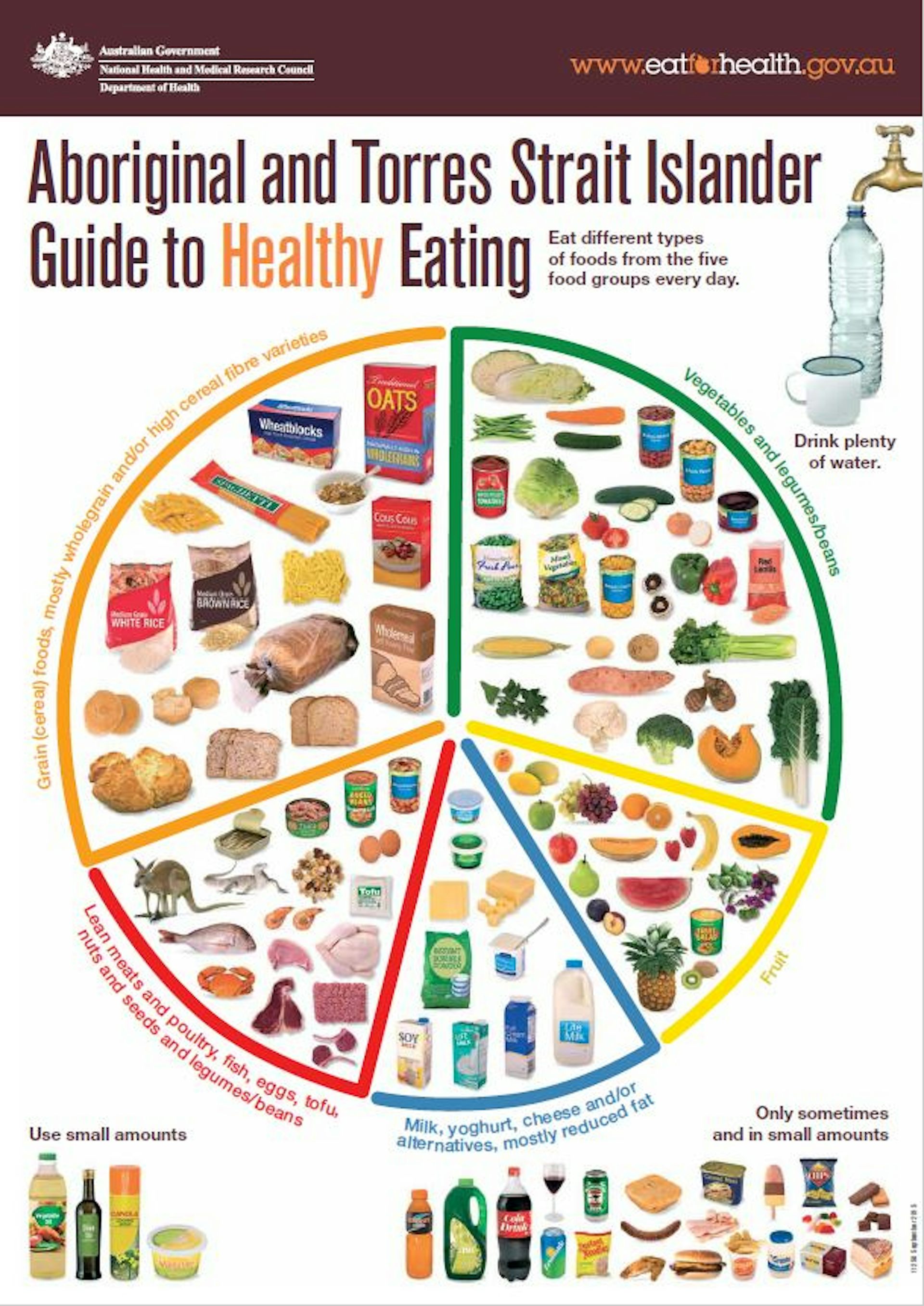 The guidelines do mention tailored foods for Indigenous peoples, such as the “Aboriginal and Torres Strait Islander Guide to Healthy Eating”, a one-page poster that includes kangaroo, seafood and goanna.