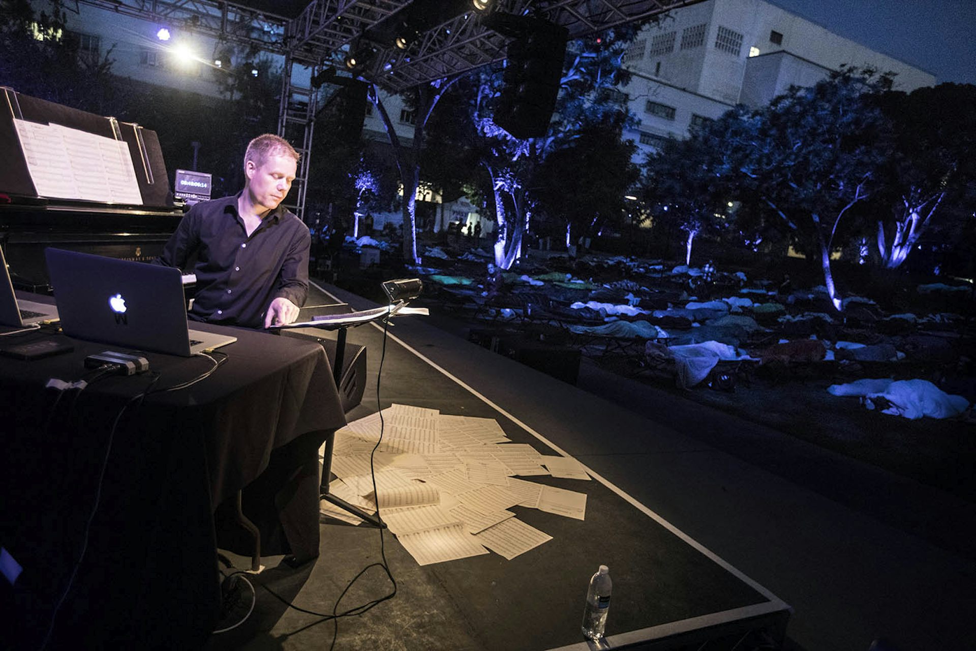As the piece unfolds through the night, the musicians alternately take breaks, perhaps to eat or use the bathroom. Richter moves from the piano around the venue, to see “what the piece is doing”, before returning to the stage to continue playing.