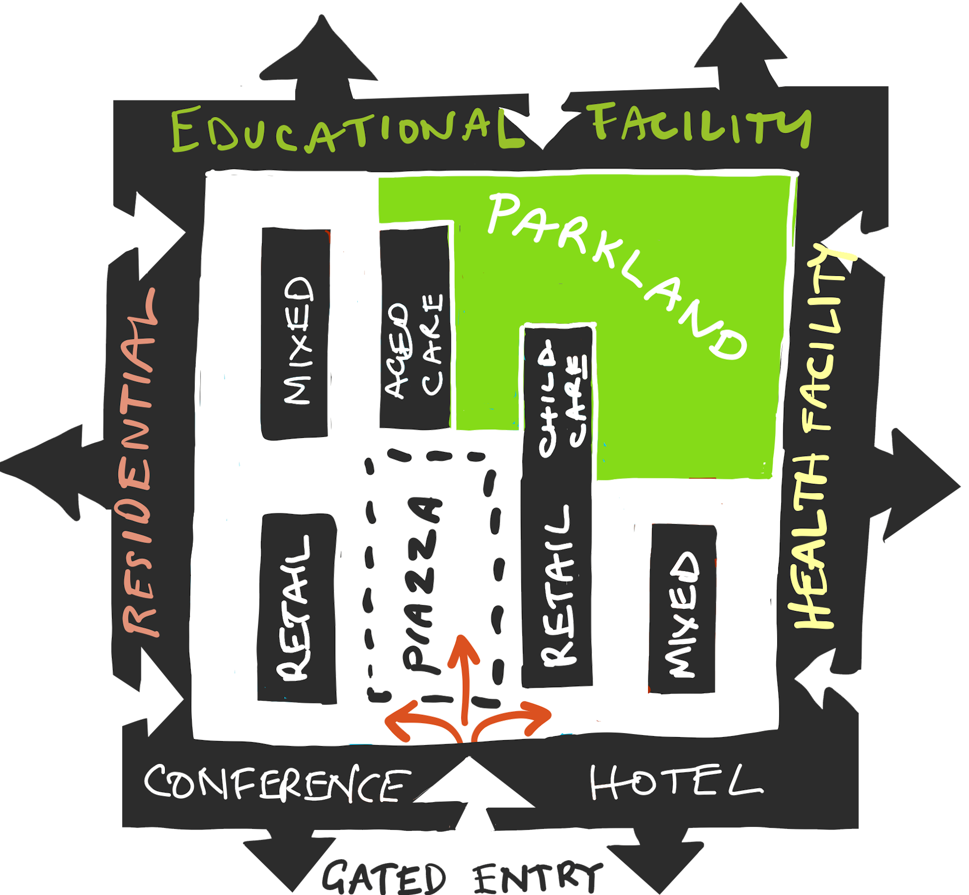In this concept, the educational, residential (non-aged-care) and health facilities make natural walls around a shared village. Car-free streets, cafes, shops, parklands and a distributed residential aged-care facility create a pleasant and safe environment for everybody. The exterior buildings are accessible from both sides for students and staff, but not for high-care residents unless they are accompanied.