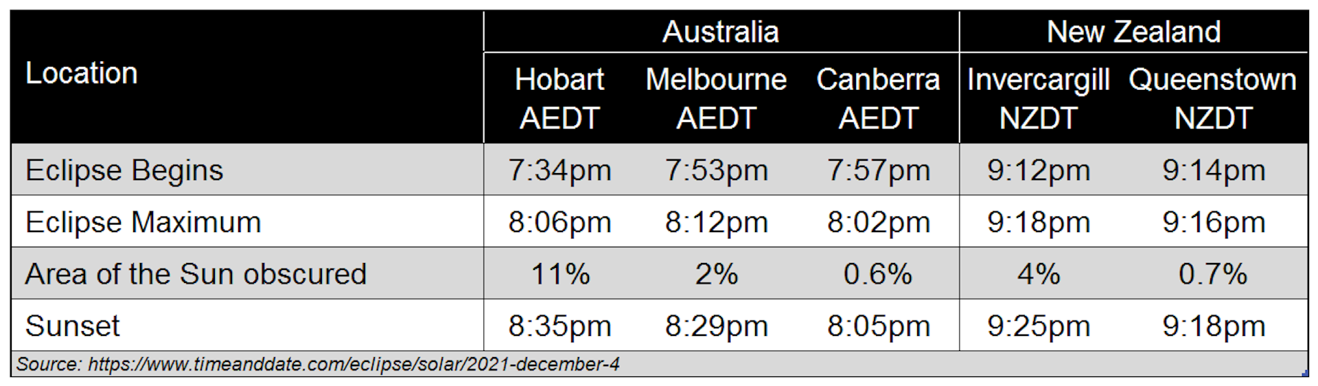 Meanwhile, the southern tips of South America, Africa, Australia and New Zealand will see a fairly minor partial eclipse. For South America and Africa, the eclipse will be in the early morning; for Australia and New Zealand it will happen as the Sun is setting.