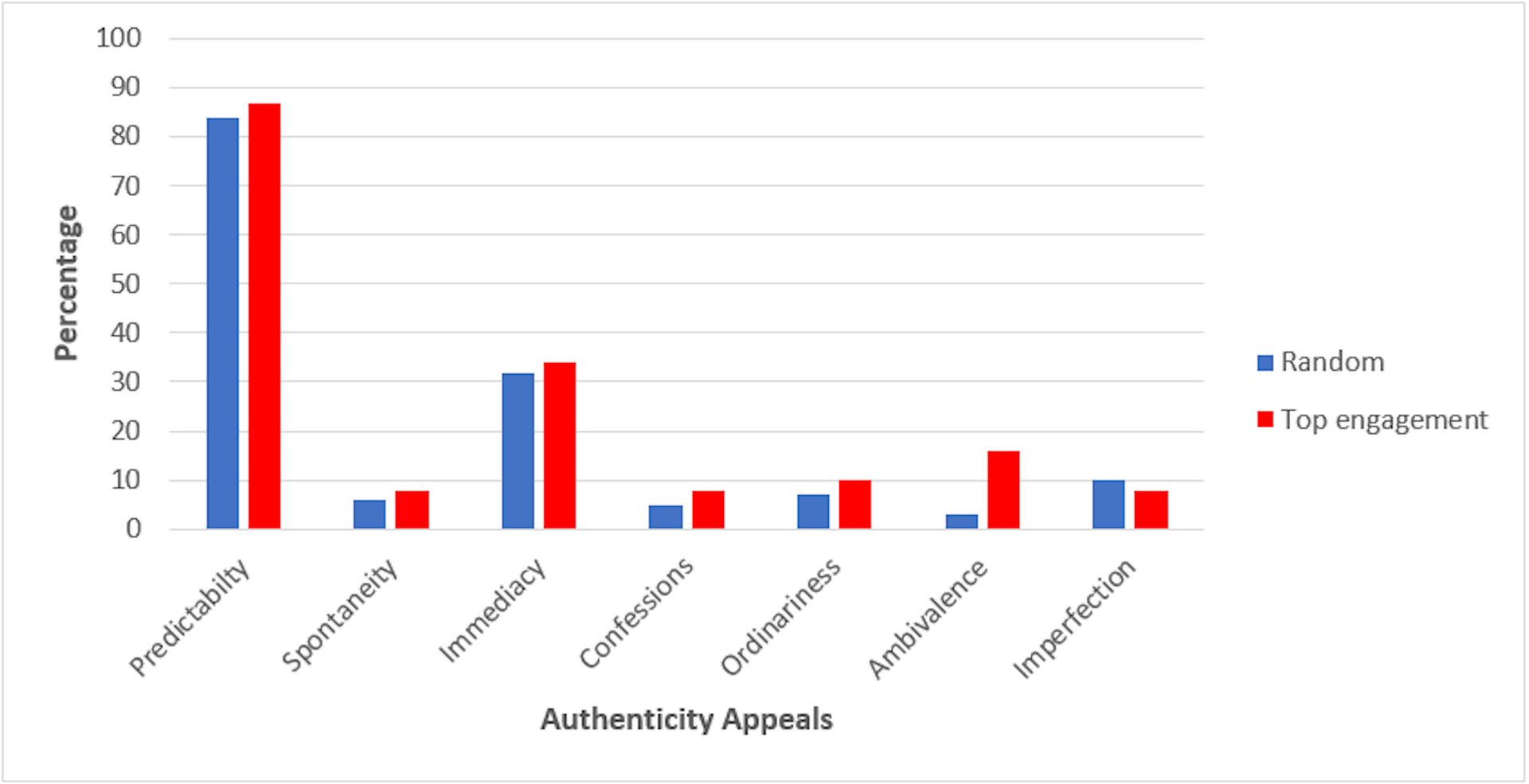 We can measure the success of content characteristics or appeals on social media, such as authenticity, by comparing high-engagement posts against a randomised sample.