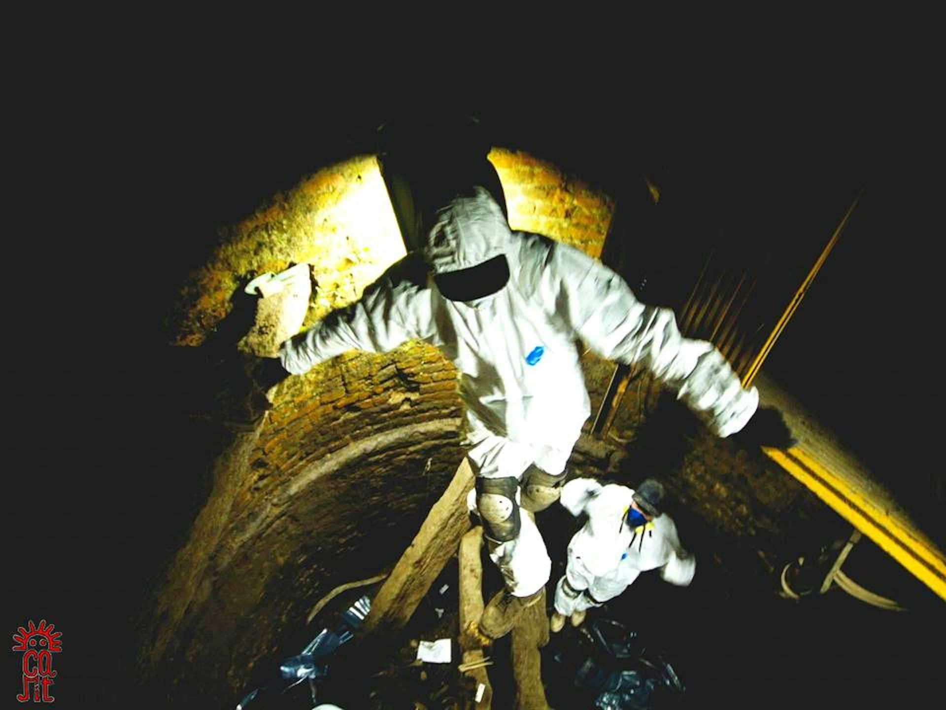 The team members wear tyvek coveralls, a form of personal protective equipment, to descend into the Argentinian well.