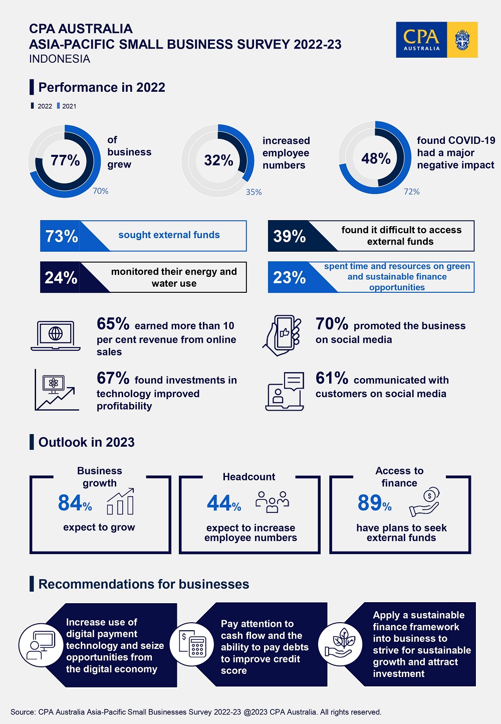 CPA Australia's Asia-Pacific Small Business Survey reveals that Indonesian small businesses remained among the most positive across Asia-Pacific in 2022. The survey covered responses from 4280 small business owners or managers across 11 Asia-Pacific markets, including 306 from Indonesia. Seventy-seven per cent reported growing in 2022 and 32 per cent hired more employees. This year is expected to be even stronger with more than four-in-10 planning to hire more staff.