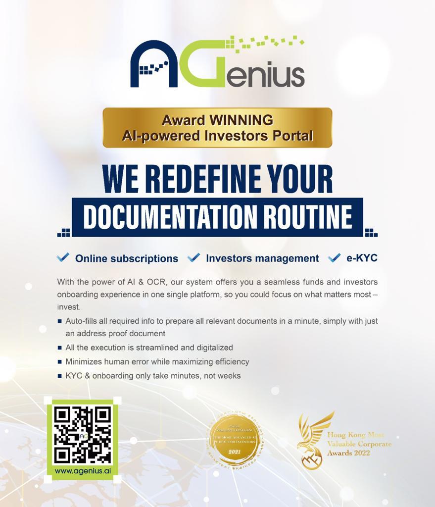 AGenius is equipped with interactive business intelligence dashboards, facilitating dynamic workflows and boosting reporting capabilities, empowering its users to cope with the demanding investment markets. With this achievement, AGenius has shown that it is a trusted and reliable platform for both fund managers and investors worldwide. In addition to its online subscription feature, AGenius has launched a new feature, E-KYC.