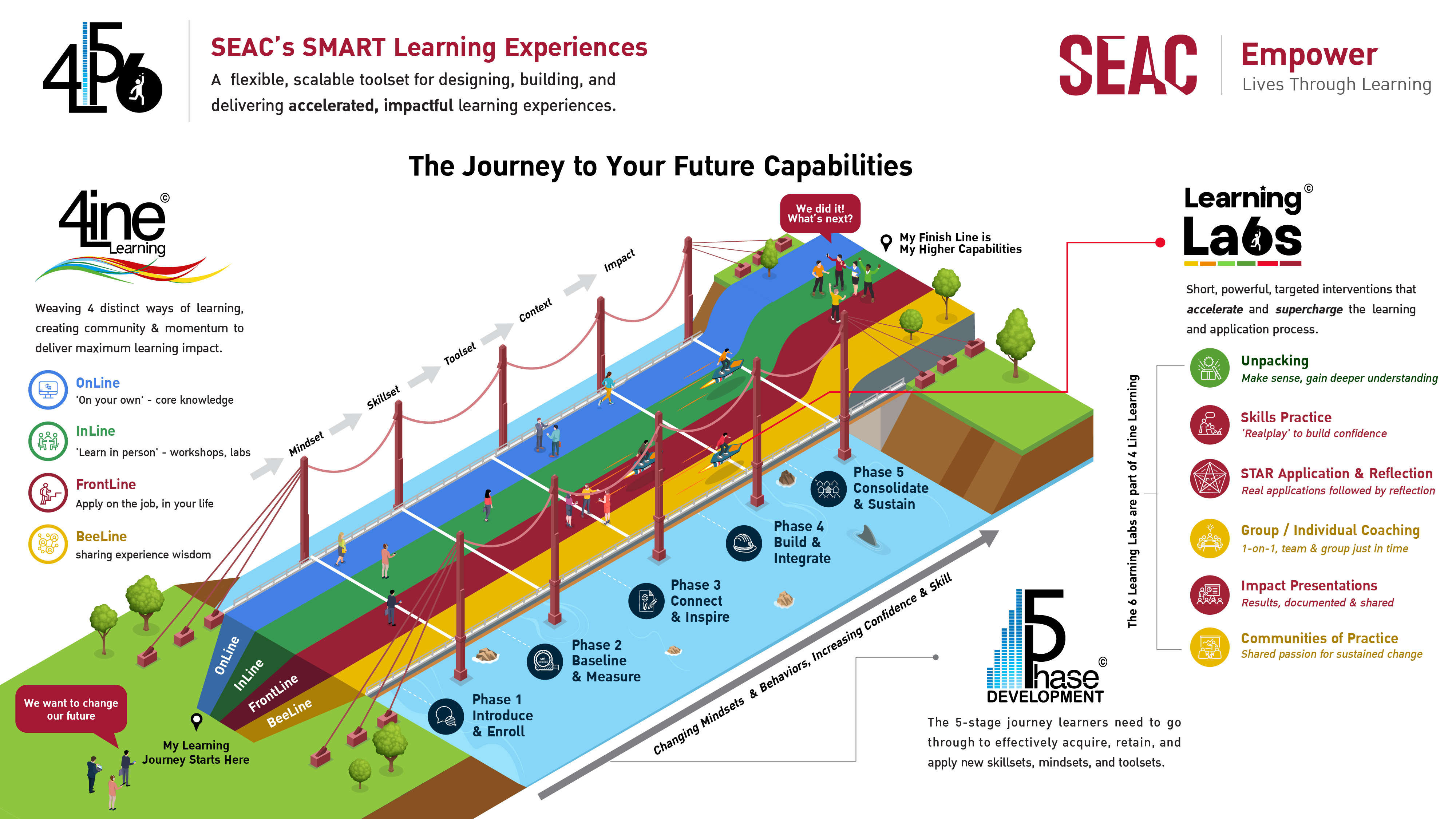 The solution begins with defining the five phases that a learner must go through to ensure buy-in, value, retention, and application: essentially, a bridge across their skill gap. Following that, SEAC weaves four distinct learning lines to support the learners in crossing that bridge to their future. Finally, SEAC incorporates targeted lab experiences to assist learners in accelerating and applying their new skills with confidence and impact. SEAC's 4-Line Learning, 5-Phase Development, and 6 Learning Labs are a technology-enabled ecosystem and toolkit for effectively closing the massive skill gaps learners' face.
