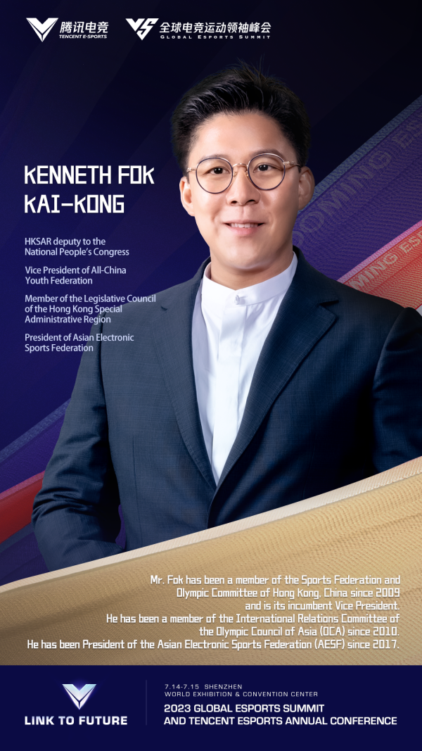 Kenneth Fok Kai-Kong: HKSAR deputy to the National People's Congress, Vice President of All-China Youth Federation, Member of the Legislative Council of the Hong Kong Special Administrative Region, President of Asian Electronic Sports Federation. As an old friend of the summit and official delegate of the Hangzhou Asian Games Esports event, President Fok and the Asian Electronic Sports Federation have made major contributions to popularizing Esports in Asia. Following on the success of the Road to Asian Games, we are eager to see the new strategies and approaches introduced by President Fok!