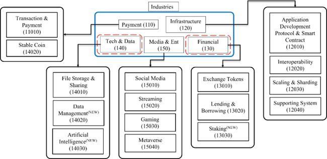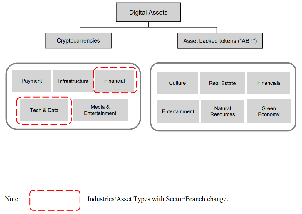 DAICS® covers both cryptocurrencies and asset-backed tokens ("ABT"), to be reviewed semi-annually at the end of June and December. On cryptocurrencies side, it is a three-tier system that groups cryptocurrencies into 5 main industries: 1) Payment, 2) Infrastructure, 3) Financial services, 4) Technology & Data and 5) Media & Entertainment. These industries are further divided into 16 industry sectors and sub-sectors to be introduced in the future. Under asset-backed tokens, there are 6 asset types: 1) Culture, 2) Real Estate, 3) Financials, 4) Entertainment, 5) Natural Resources, 6) Green Economy. These asset types are further divided into 31 branches and sub-branches to be introduced in the future.
