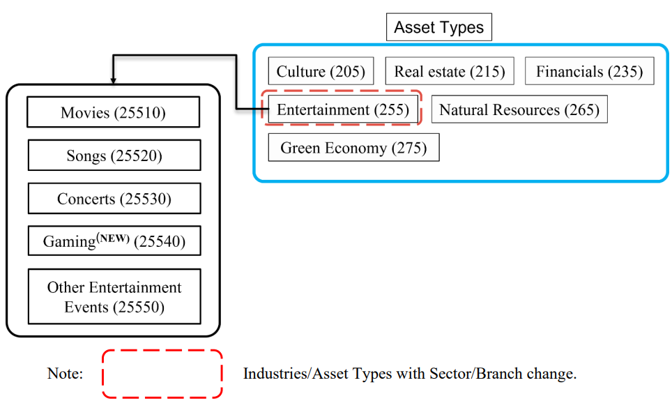 | Entertainment: (255) Definition Ownership of the IPs assets in the area of entertainment in real world such as concert, play, shows, circus, musicals, songs, movies, games, events and programs, and souvenir collectibles that is derived from the above areas. | Movies (25510) | This shall be further developed in the future with more digital assets available in the market | |