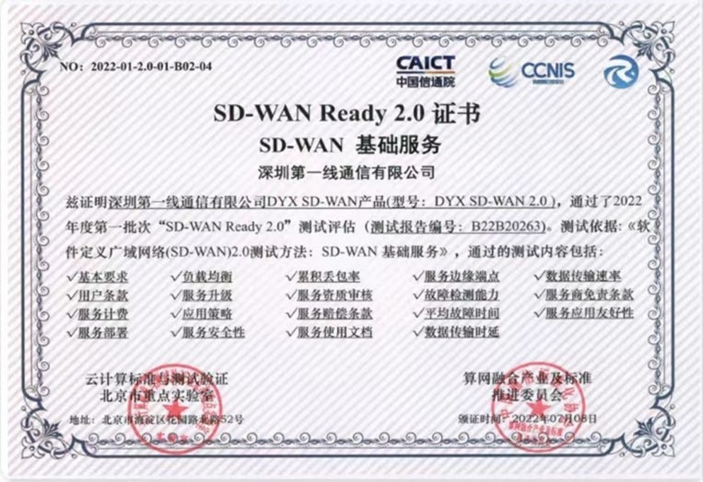 The evaluation covered multiple aspects of the solution including: service deployment, load balancing, service security, application strategy, fault detection capability, data transmission latency, data transmission speed, etc. DYXnet SD-WAN solution has successfully passed all 19 items in the "SD-WAN Ready 2.0" test requirement, which indicates the quality and technical capabilities are above SD-WAN's industrial standards and technical norm.