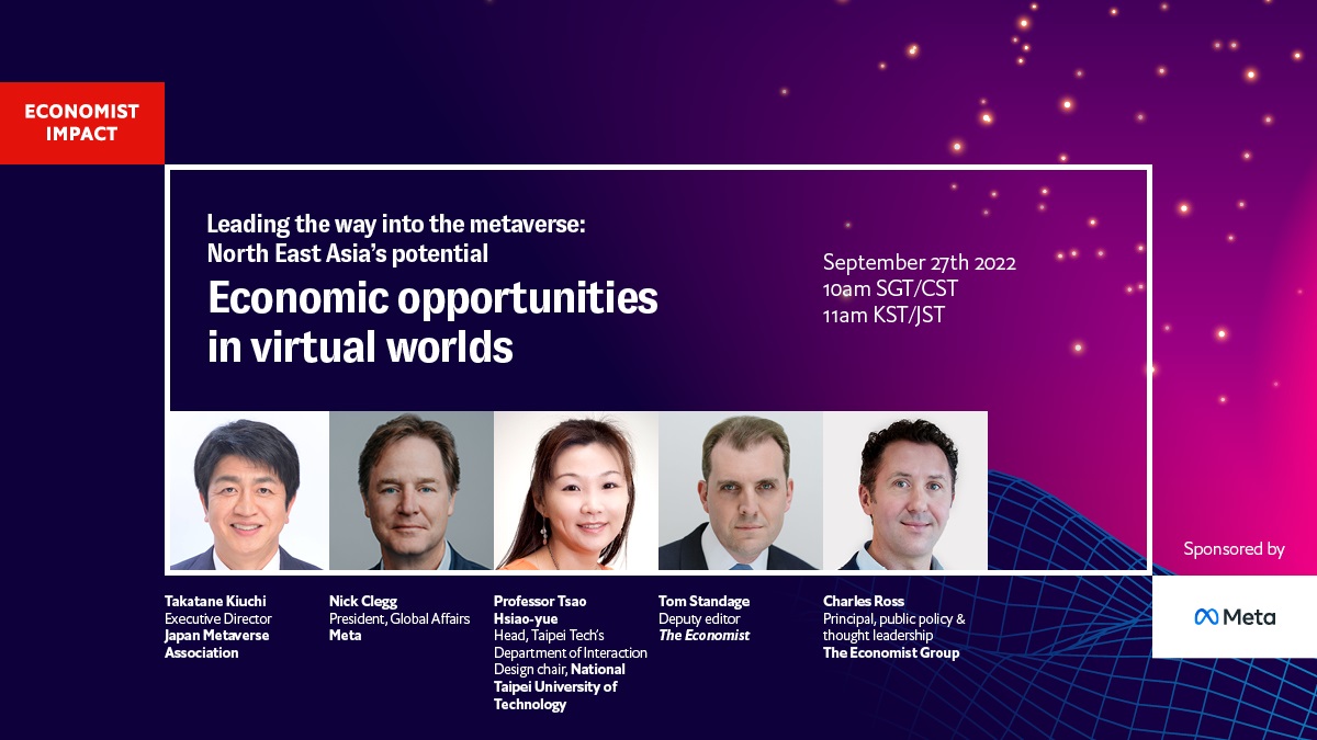 Taking place online next week on Tuesday September 27th 2022 at 10am SGT/CST | 11am KST/JST, join Economist Impact, sponsored by Meta, as we explore the economic opportunities and future of interconnected, immersive virtual worlds.