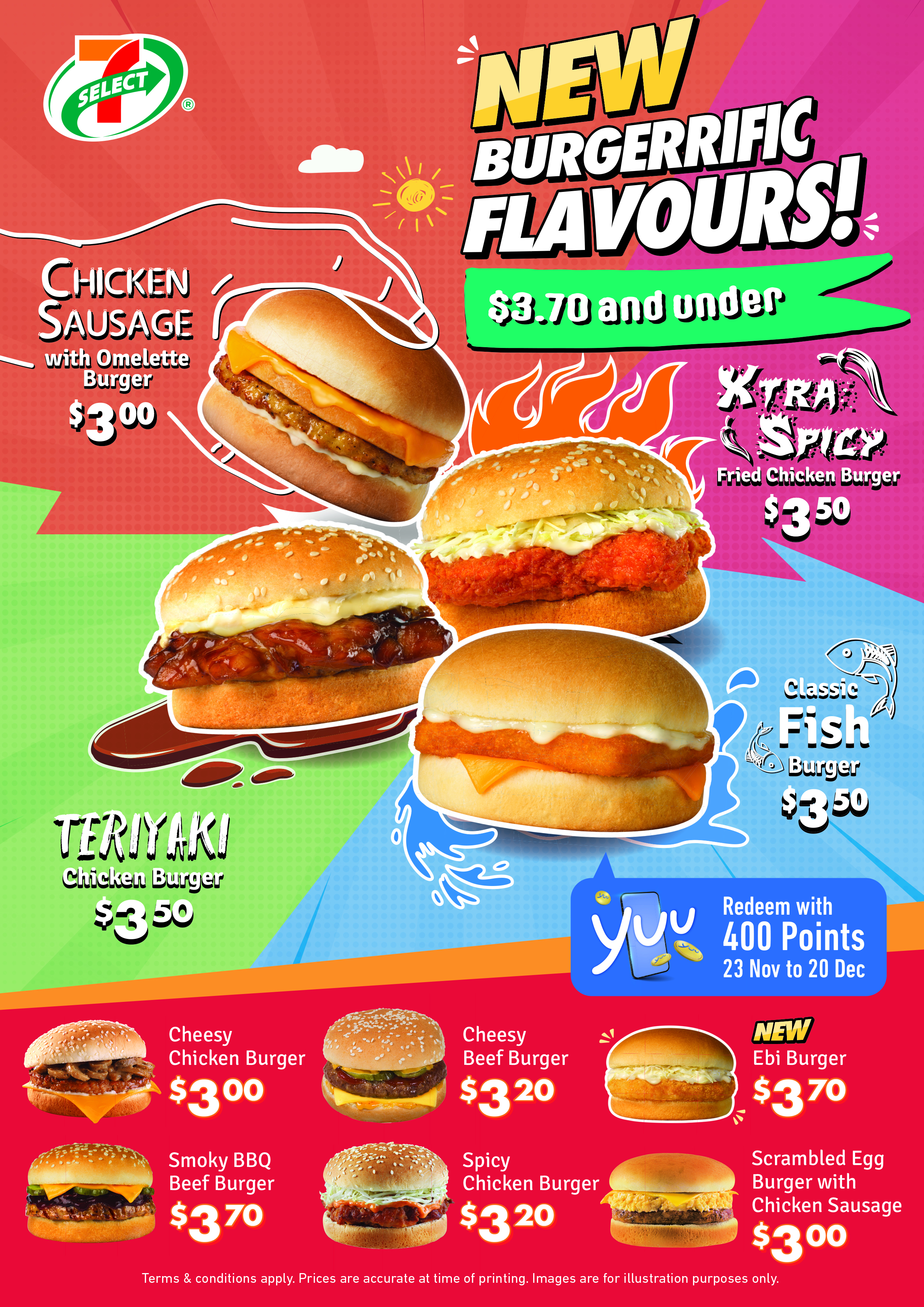 Plus enjoy this exclusive yuu Offer! Earn 3x Points when you buy any of these 7-Select Burger (Teriyaki Chicken/ Xtra Spicy Fried Chicken/ Ebi/ Chicken Sausage with Omelette) . You can also redeem a 7-Select Fish Burger for just 400 Points!