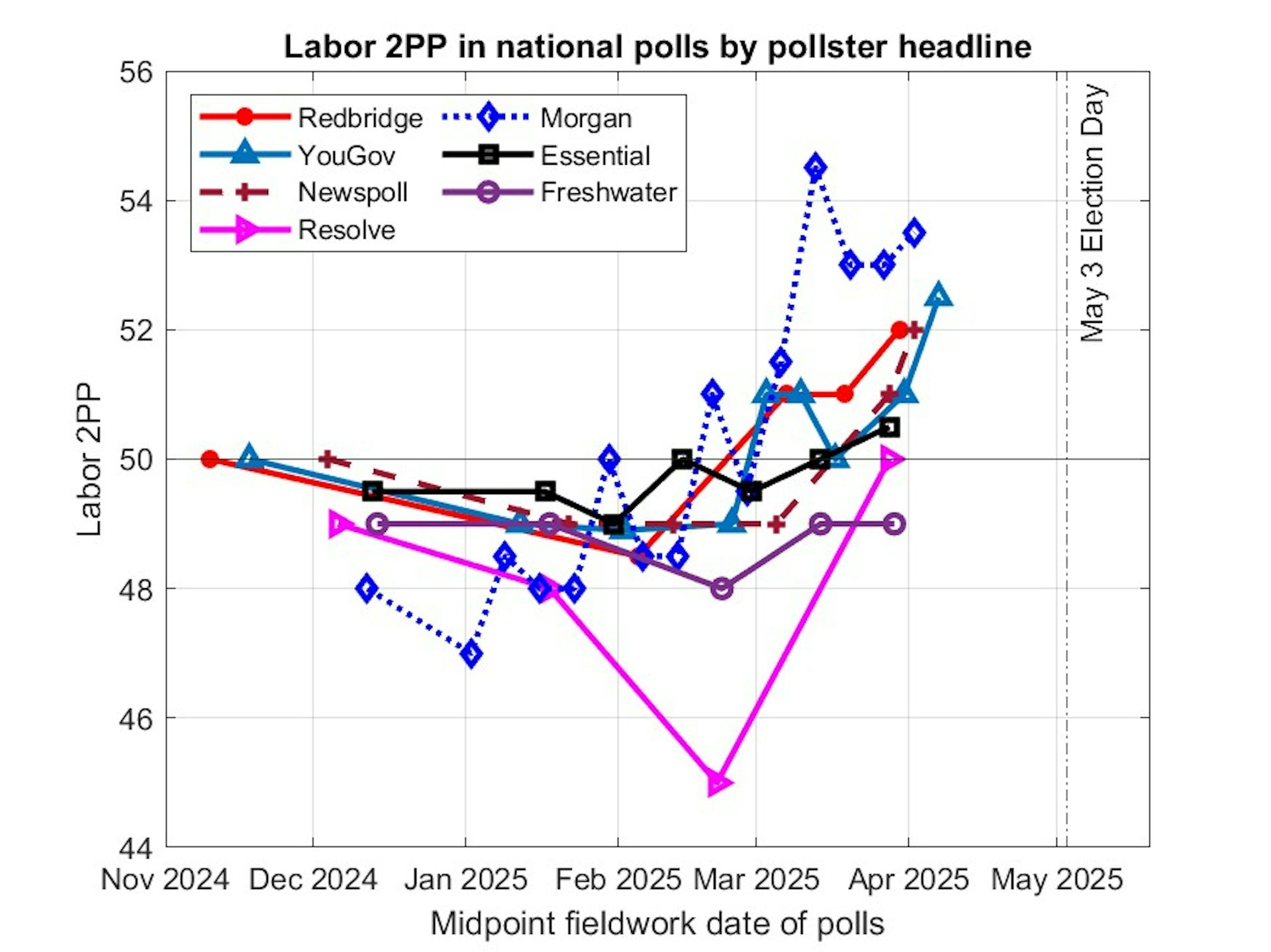 A national YouGov poll, conducted April 4–10 from a sample of 1,505, gave Labor a 52.5–47.5 lead, a 1.5-point gain for Labor since the March 28 to April 3 YouGov poll. This is Labor’s best result in YouGov for 18 months, and slightly better for Labor than the 2022 election result (52.1–47.9 to Labor).