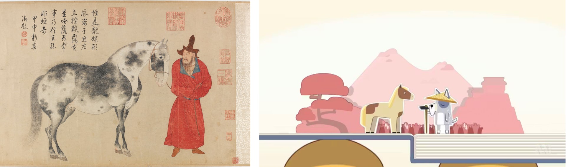 Horse and groom, by Zhao Yong 趙雍 (1291–1361); the Bluey episode The Sign.