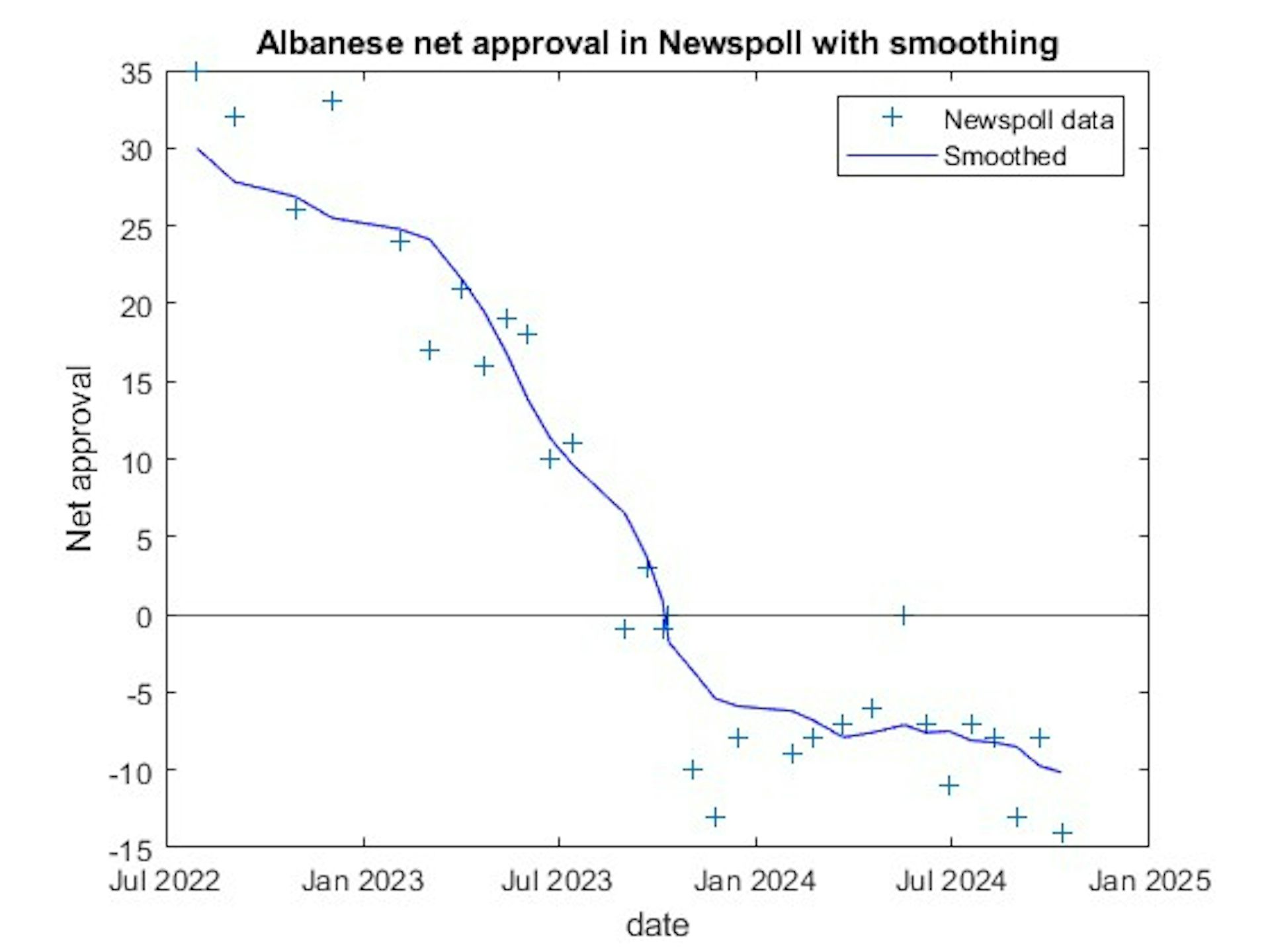 The graph below shows Albanese’s Newspoll net approval ratings this term. The data points are marked with plus signs and a smoothed line has been fitted. Albanese’s net approval has been below -10 in two of the last three Newspolls, causing the trend line to turn down.